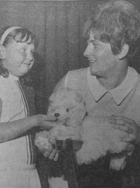 Janice Law presents a ‘toy poodle’ pyjama case to Miss Ann Pederson, of 128, Dayland’s Avenue, Conisbrough At her 21st birthday party on Saturday