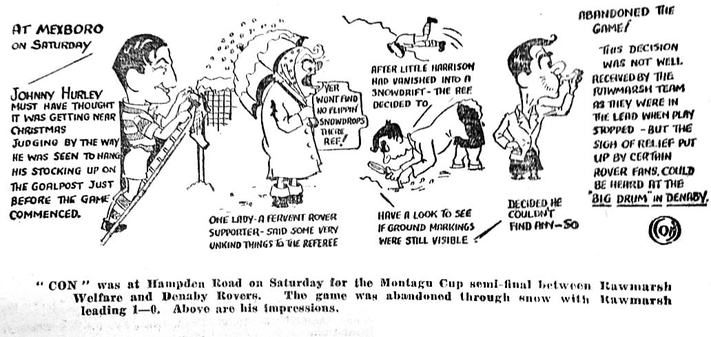 Montagu Cup final – Rawmarsh Welfare and Denaby Rovers Abandoned (cartoon)12 March 1949South Yorkshire Times March 12, 1949