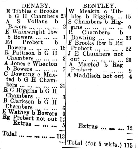 The Denaby attack was weak and Wathey was not tried, though two slow bowlers had done all the damage in the first innings of the match. Bentley soon hit off the arrears and won by 5 wickets. Bower and Chambers each bowled 19 overs for Bentley, and Bower’s return was 5 wickets for 37 runs. Chambers took the others 5 for 71.