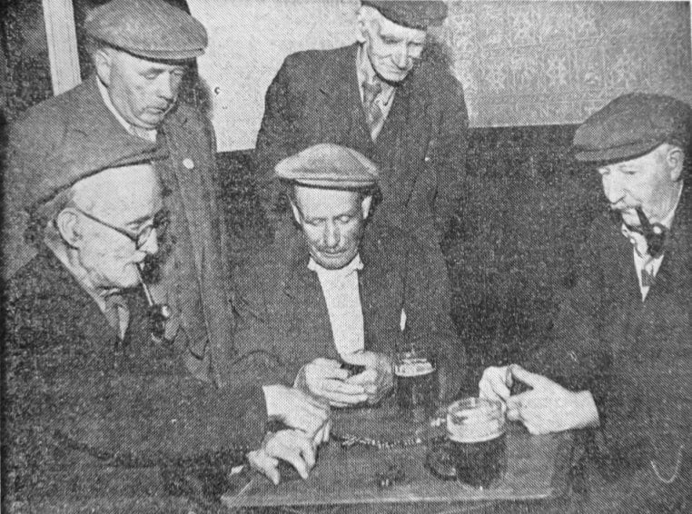 The “unbeatables,” all old age’ pensioners, are patrons of the Eagle and Child Hotel, Conisbrough. Every day for years they have played dominoes at the pub,” but because they have not enjoyed a hard game for some considerable time their enthusiasm is waning.