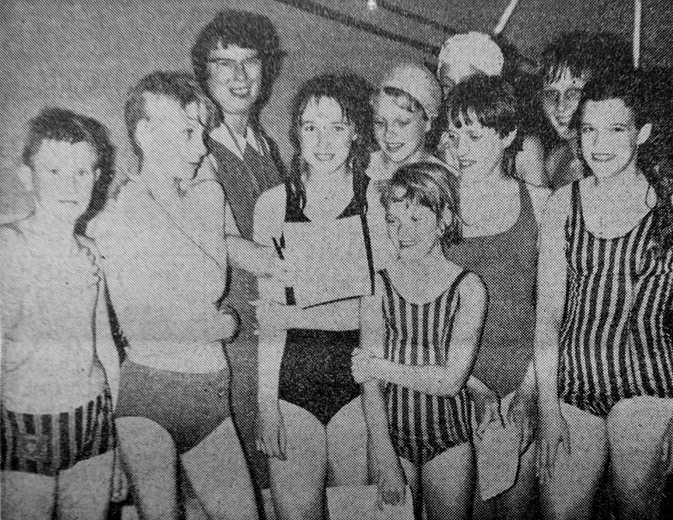Mrs F. O. Broadhead discusses the programme with scholars of Northcliffe High School at the Conisbrough Urban Council swimming gala at Denaby Baths on Tuesday.