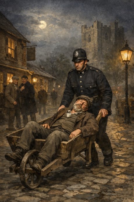 Police-constable Leeson stated that at 9.40 p.m. on the day named he found the defendant on the high road in Church street very drunk. He wheeled the defendant to his home in a wheelbarrow. (Laughter.)