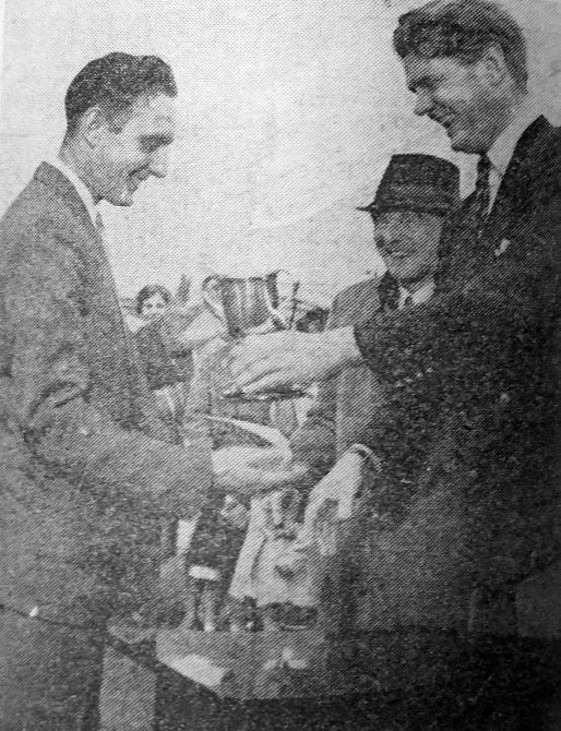 Mr. F. C. H. Wadsworth, President of Mexborough and District Evening Cricket League, and director of the “South Yorkshire Times” printing Co Ltd., Presents the “Crane” cup to Harold Hobson, captain of Conisbrough C. C., After Sundays final.