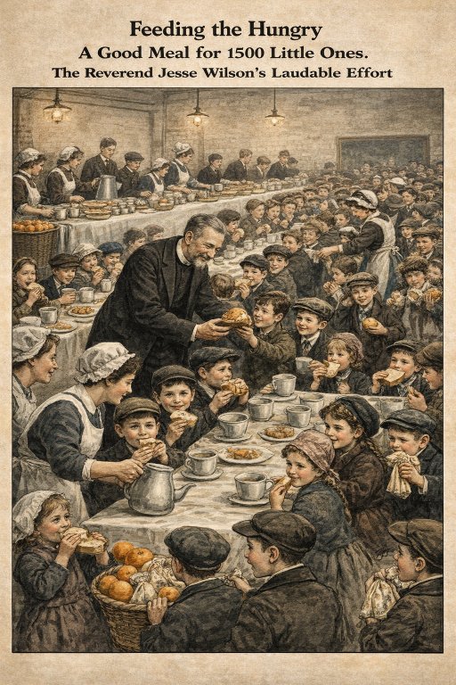 And could those who contributed had seen the gladness and eagerness with which the children partook of the good things provided, they would have felt more than repaid. The idea of giving all the children a tea arose in the reverent Wilson’s mind as he daily witnessed the sight of pinched and hungry little ones, a condition of things brought about through no fault of their own, and no sooner had the thought come than action followed, and, as a result of his public appeal, the reverent gentleman achieved a conspicuous success.
