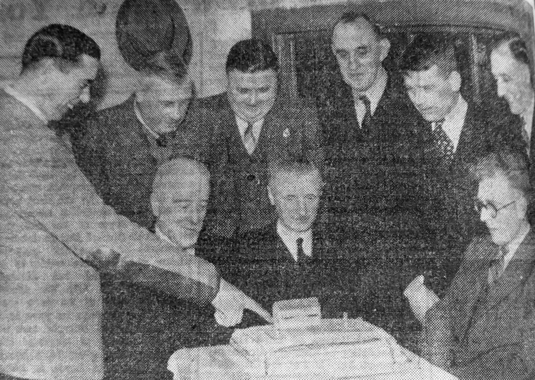 Ellis Robinson, Yorkshire spin bowler, shows Conisbrough Cricket Club officials at their annual dinner on Tuesday, an iced cricket ground cake complete with stumps, green wicket and pavilion, made by Mr W Hepworth, first team playing member of club.