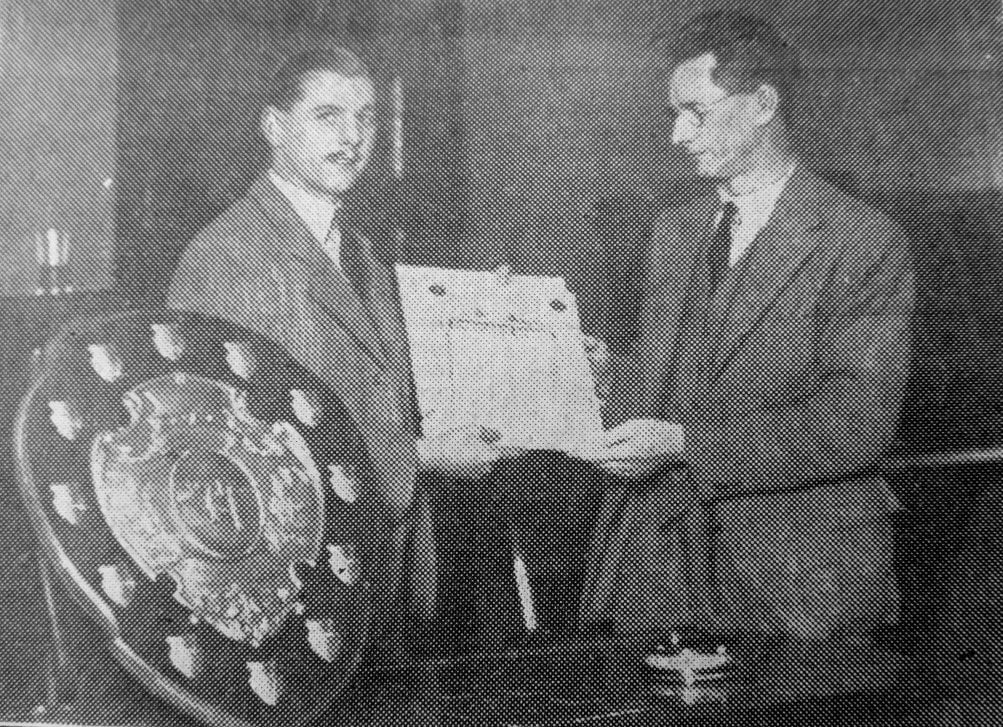 Mr. Norman Hulley (left) presenting a life saving certificate award by the St. John Ambulance Brigade to Mr, H. Whimpenny for ambulance services in the Denaby Colliery which resulted in the saving of a life of an injured man in 1927.