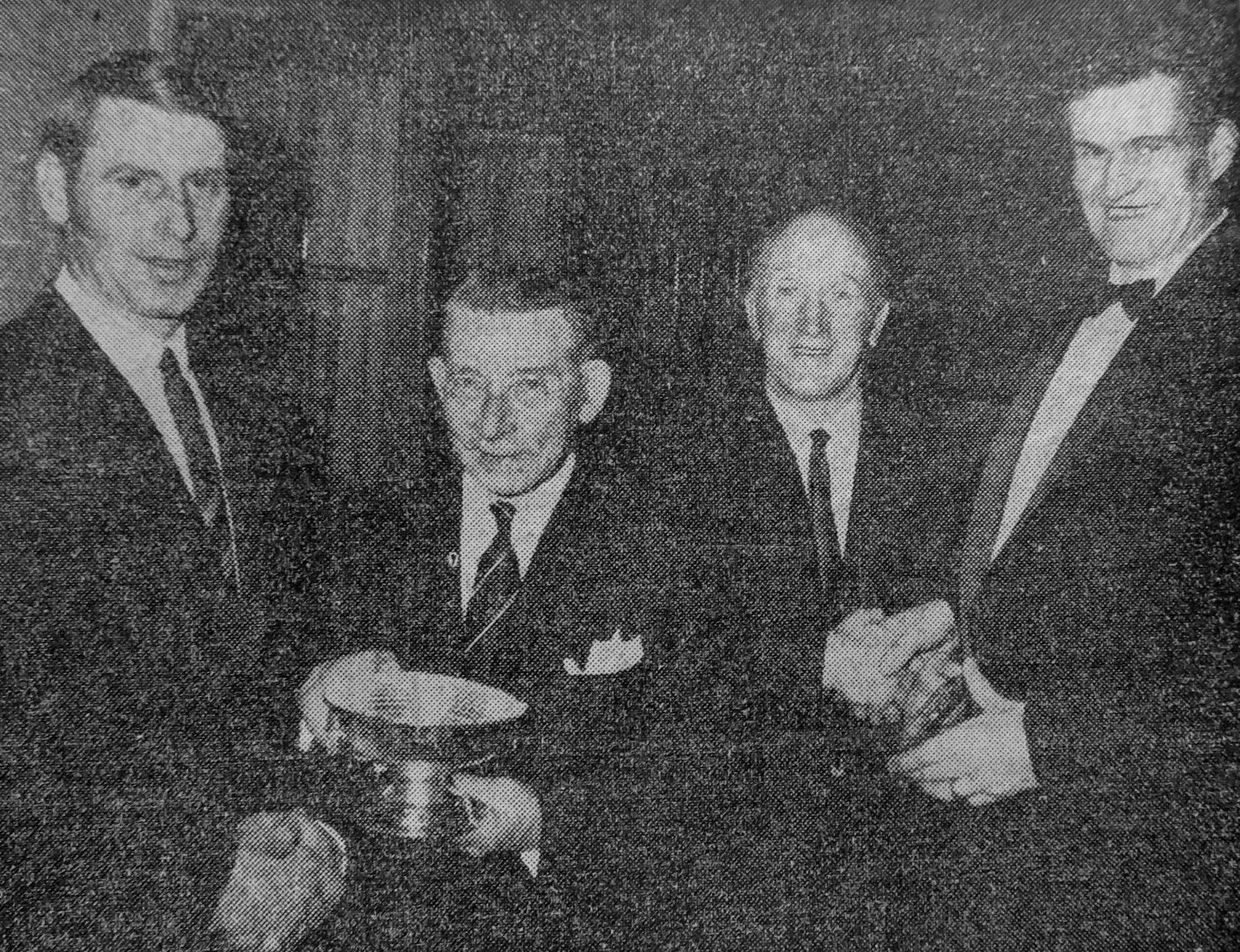 A Double Presentation at Old Denaby C.C. annual dinner at the Empress rooms last Saturday as Mr. Cyril Gouldin (captain, left) presents a rose bowl to MR. Eric Holmes in Appreciation of many years’ service as club umpire, while Mr. Malcolm Scott (right), receives the best batting average award from club President Mr. Walter Reeve.