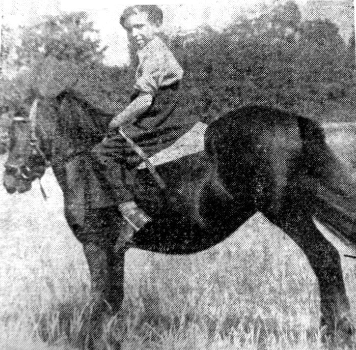 A quieter mount for 19-year-old Percy Tomblin, former Conisbrough Post Office Messenger boy now apprentice jockey at Newmarket. Picture shows Percy on a pony belonging to the daughter of his trainer, Mr, H. O. Leader.