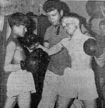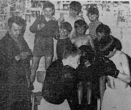 Mr Roy Regan helping Philip Cockage and John Wilford, with their boxing