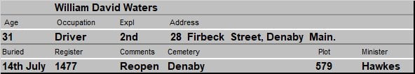 On Sunday at Denaby Cemetery, Rev. S.F. Hawkes officiating, the burial of William David Waters took place.