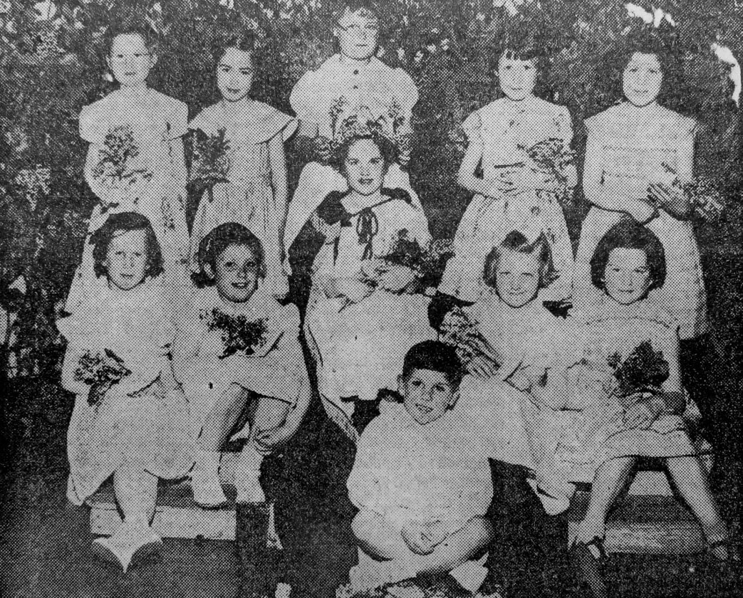 Carol Jones, May Queen of Conisbrough Station Road Infants’ School, is crowned by Irene Mason.