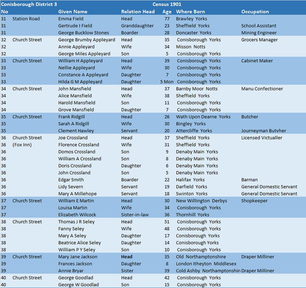 Census 1901 – Conisborough District 3.04 Church Street & Station Road