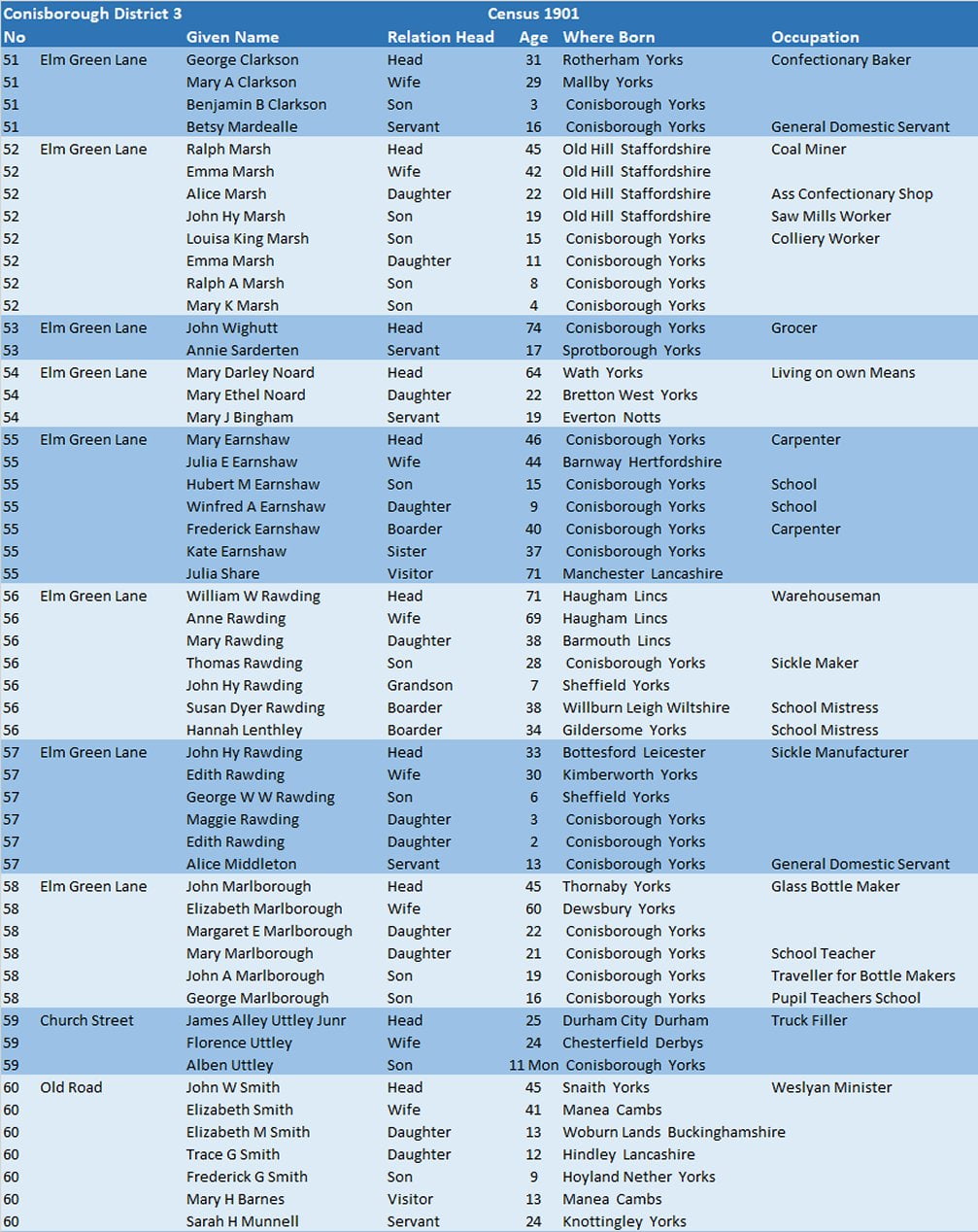 Census 1901 – Conisborough District 3.06 Elm Green Lane & Old Road