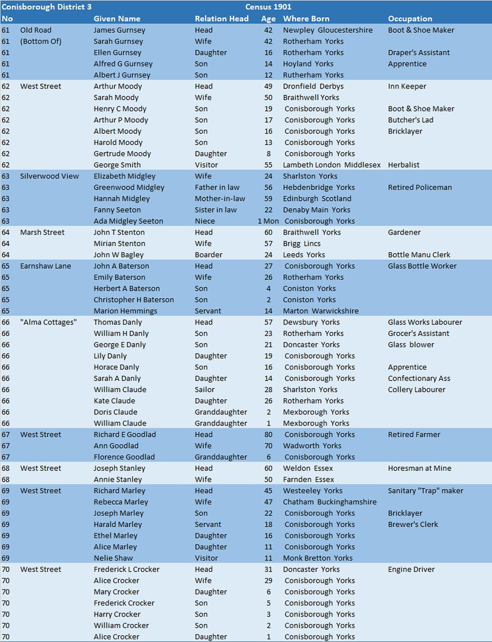 Census 1901 – Conisborough District 3.07 West Street, “Alma Cottages & Various