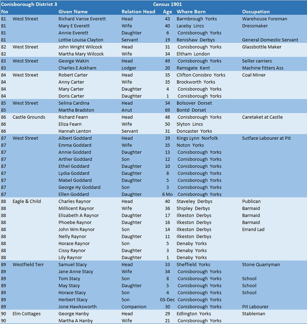 Census 1901 – Conisborough District 3.09 West Street, Castle Grounds, Eagle & Child