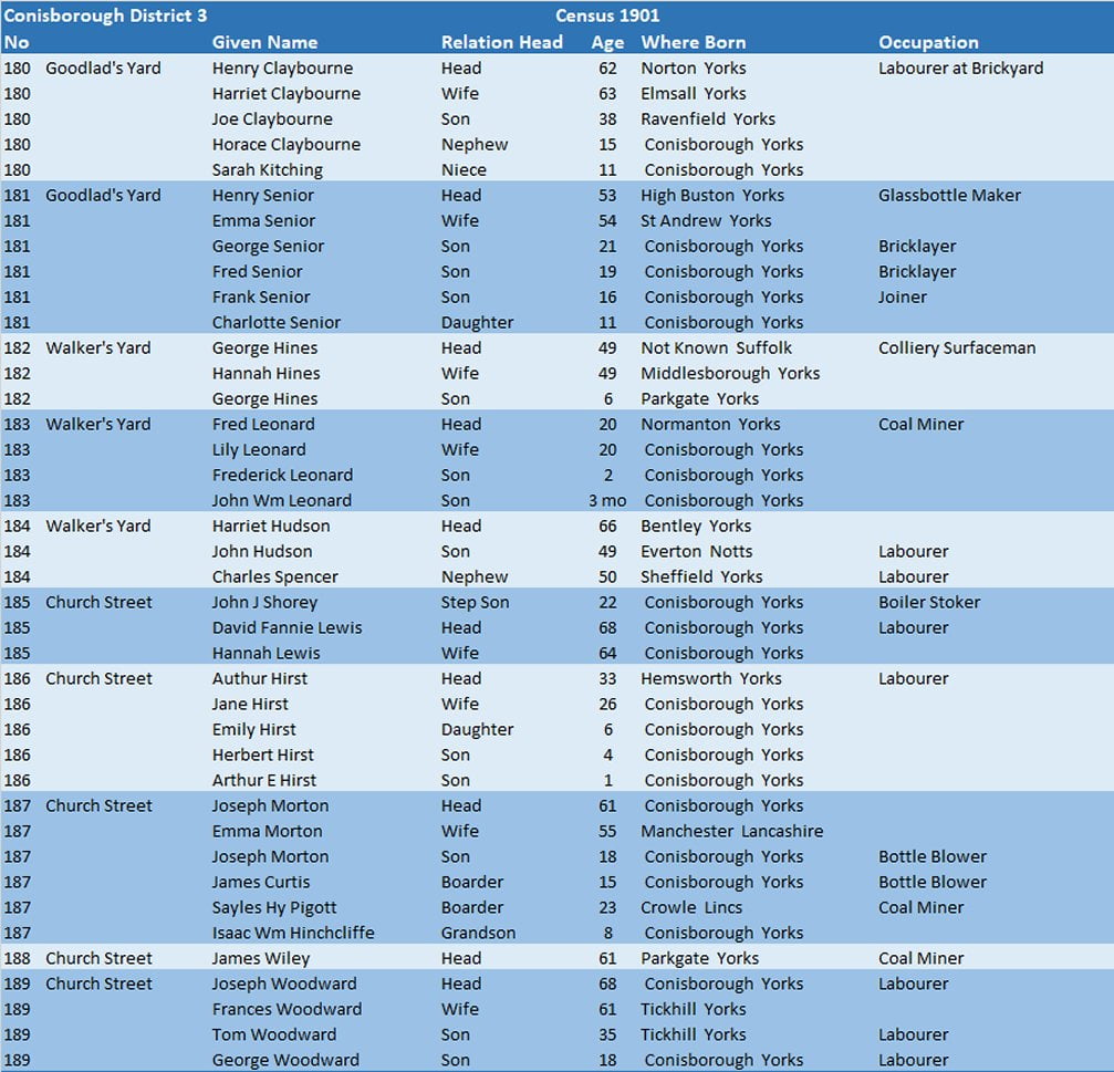 Census 1901 – Conisborough District 3.19 – Goodlad’s Yard, Walker’s Yard & Church Street