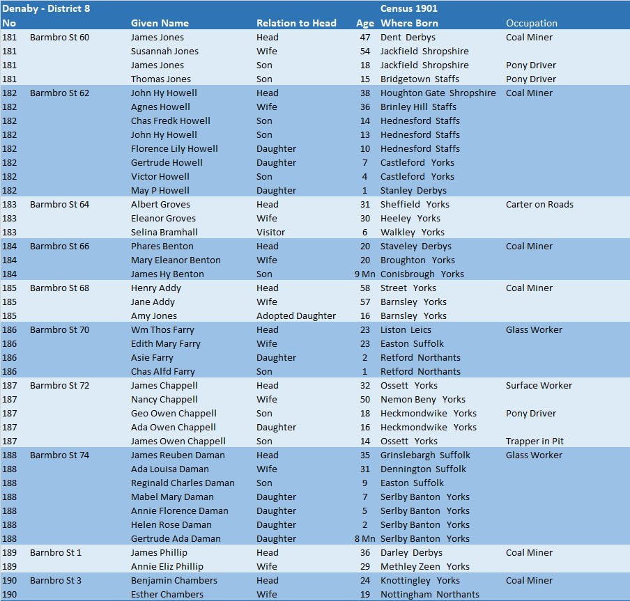 Census 1901 – Denaby District 8.19 – Barmbro’ St.