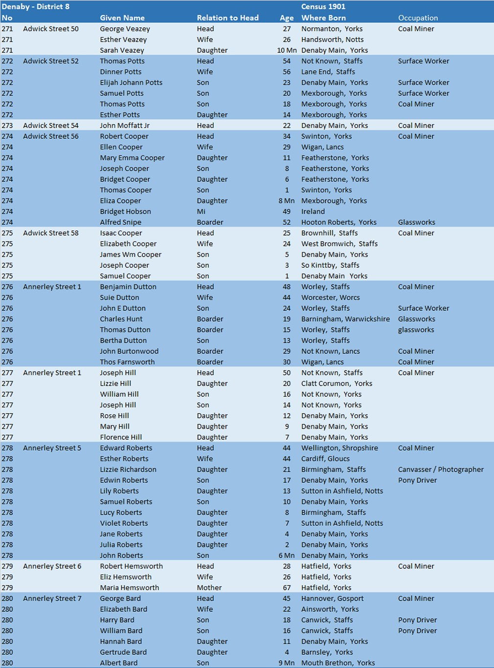 Census 1901 – Denaby District 8.28 – Adwick Street, Annerley Street