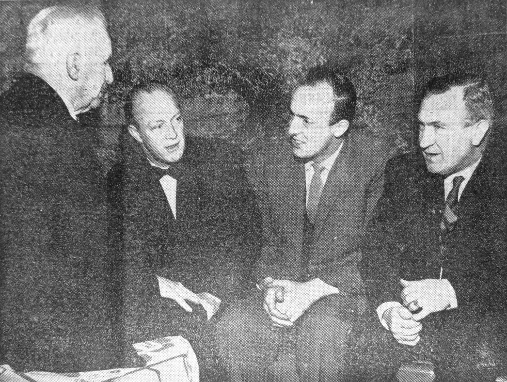 A. Foster (President of the Doncaster Cricket League), chatting with officials of Conisbrough Cricket Club, Mr. A. Chadwick (President), Mr. M. H. Blackburn (dinner secretary) and Mr. A. R. E. Harrison (chairman), at the Chib’s dinner-dance at Denaby Baths Hall.