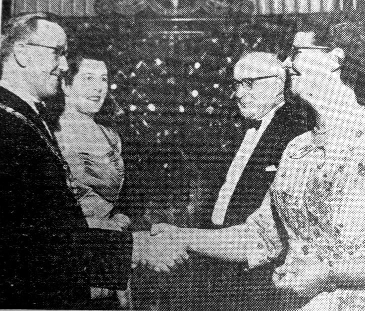 Coun. J. Prendergast, Chairman of Conisbrough Urban Council, and Mrs. Prendergast, greeting guests at the civic dance at Denaby Baths Hall on Friday.