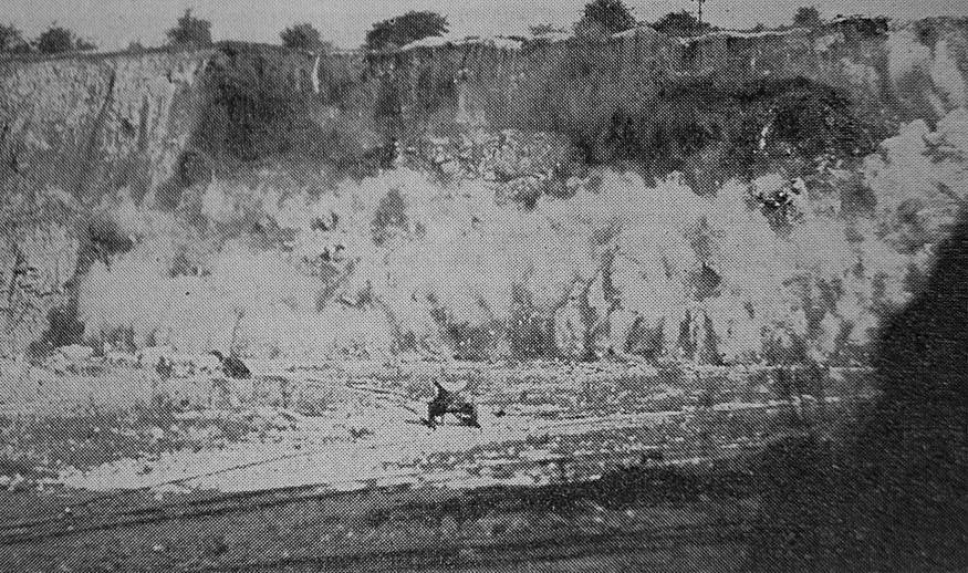 In the biggest fall in its history, 60,000 tons of dolomite were brought down in single blast at the quarry of the Conisborough Cliff Company yesterday.