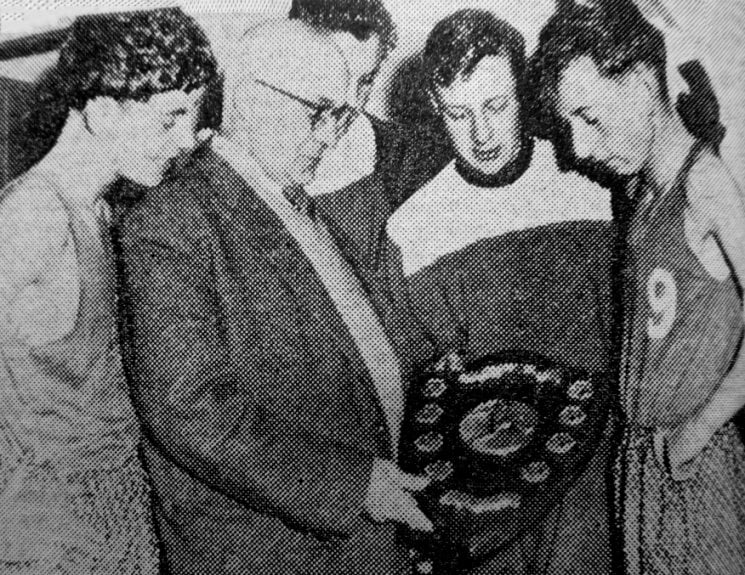 Conisbrough Clowns five-a-side football team admire the shield offered in the tournament at Denaby Baths on Monday.