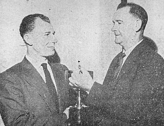Mr. Cyril Swift receiving the combined average cup from Mr. W. Shillow at Conisbrough Homing Society prize night at the Station Hotel on Saturday.