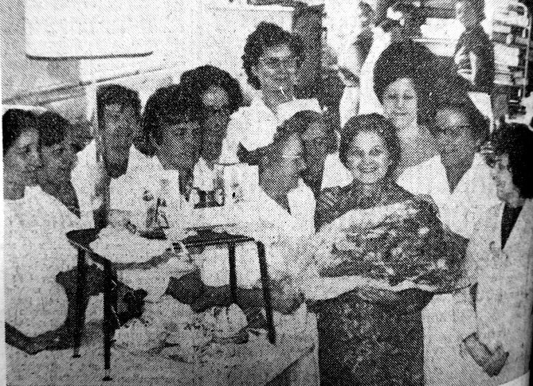 Retiring after 18 years as kitchen maid at Conisbrough Nortcliffe School, Florence Toseland (centre) receives farewell gifts from her colleagues