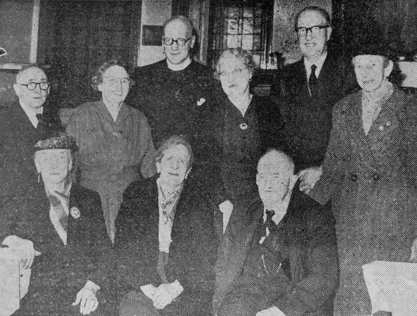 Some of the oldest members who were at Conisbrough Over 80’s Christmas party: Mrs. C. Goddard (85), Mrs. S. A. Rose (88), Mr. W. Akester (85) and Mrs. K H. Chambers (82). They are seen with Mr. W. Parker. Mrs. A. E. Rose, Rev. G. F. Braithwaite (Vicar of Conlsbrough), Mrs. C. Taylor and Mr. J. E. Greathead.