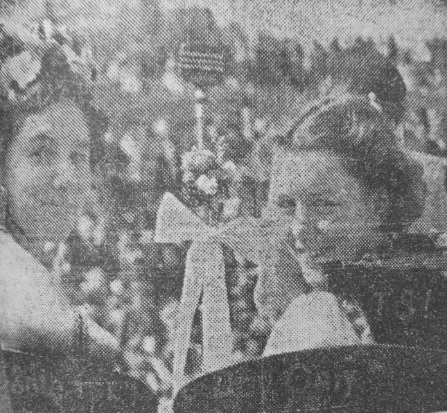 Conisbrough Queens, Miss Hazel Parry (left), the retiring Queen, and Miss Irene Beardsley (crowned on Whit Monday) have a smile for the “Times” photographer on a roundup of “Sings,” sports and other events.
