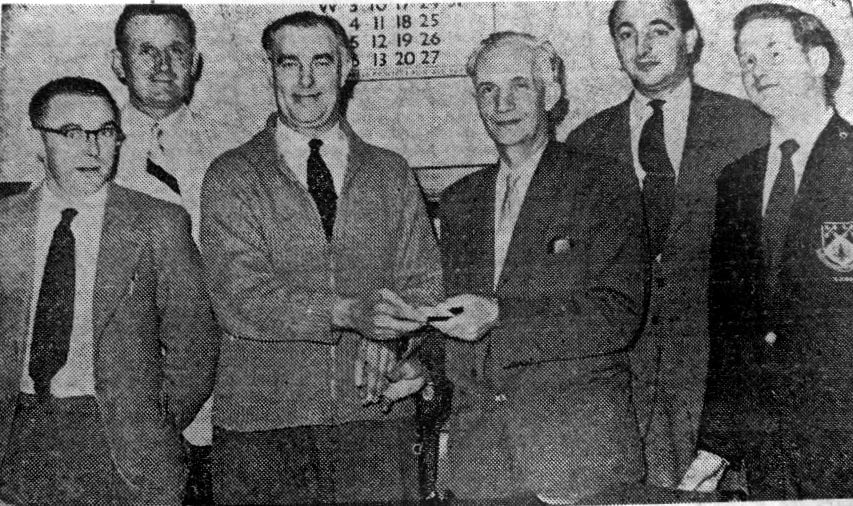 Mr F Roberts presents Mr J Proctor (retiring Chairman) with a cigarette lighter at Conisbrough Youth Council meeting on Tuesday at the Council Offices.
