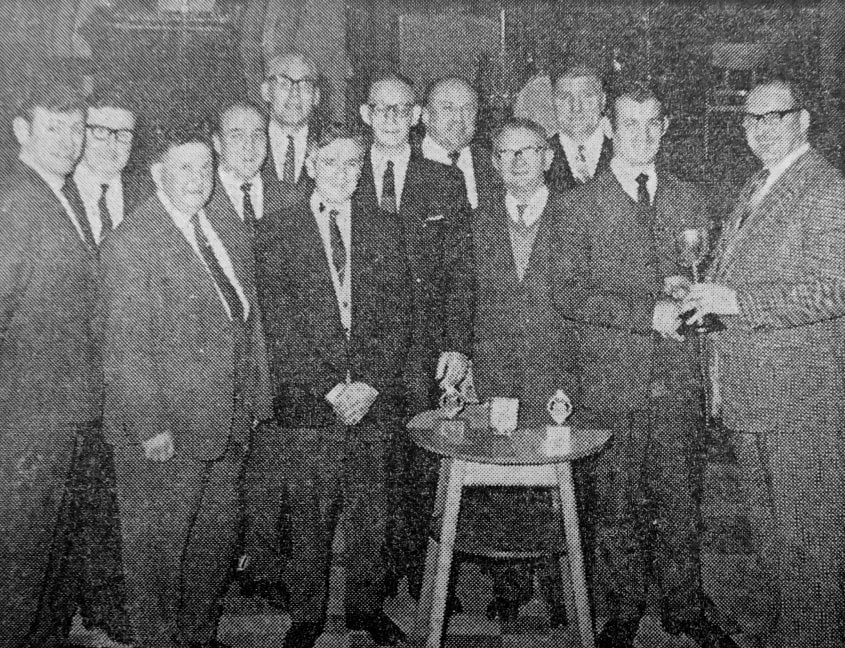 Mr. A. Roberts (right) presents Section āEā trophies to the captain of Denaby and Cadeby bowls team, E. Hanks, at the Miners’ Welfare Institute on Friday.