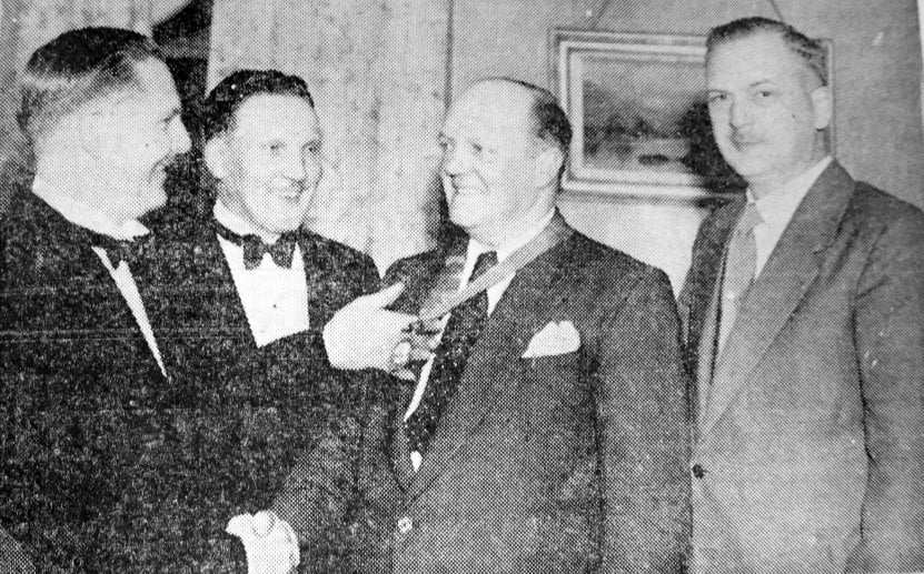 New chain of office being presented to Mr F. N. P. Lax, president of the Denaby and Conisbrough Chamber of Trade, by Mr. D. Whyers (treasurer) at the president’s dinner and social evening on Wednesday at the Star Hotel, Conisbrough.