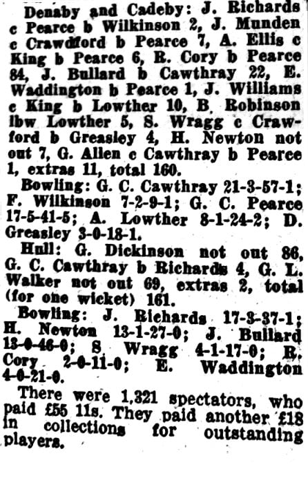 Denaby’s innings did not last long, for Cory was bowled by Pearce when he had added one more to complete a fine fighting innings of 84, and they were all out for 160, leaving Hull to get 11 runs to win the match, with nine wickets to fall. They got then without further loss, Dickinson being top scorer of the match with 86 not out, and Walker having 69 to his credit.