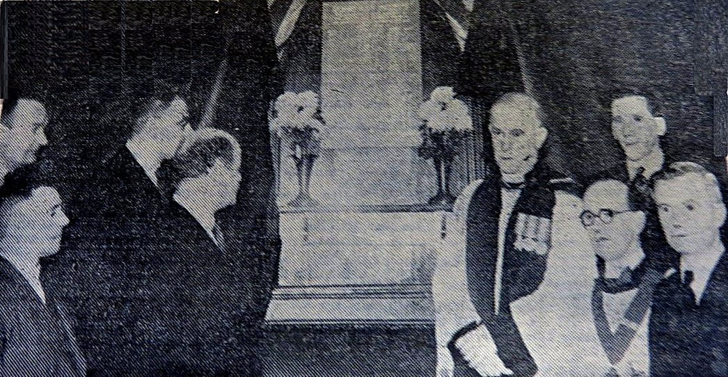 Picture shows a tablet unveiled at Denaby Main Institute on Friday evening by Mr G.C. Payne (left centre), recording the names of Institute members who served with the Forces during the war.