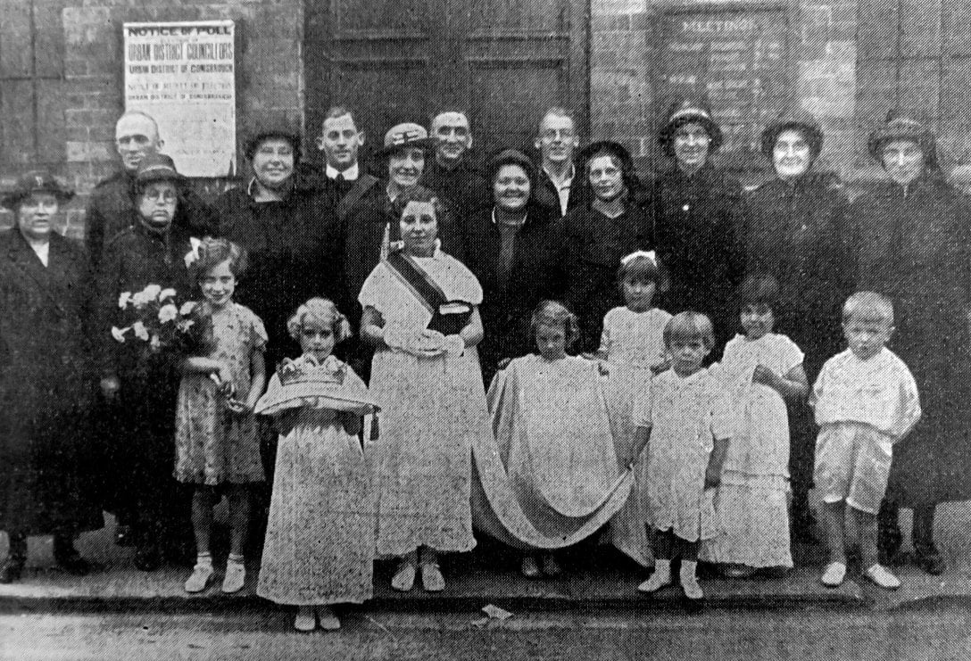 A group at the Denaby Salvation Army headquarters on Saturday when Connie Worsley (centre) was crowned Anniversary Queen by Mr  RG Troughton (wife of the chairman of Conisbrough U.D.C, who is standing immediately behind her