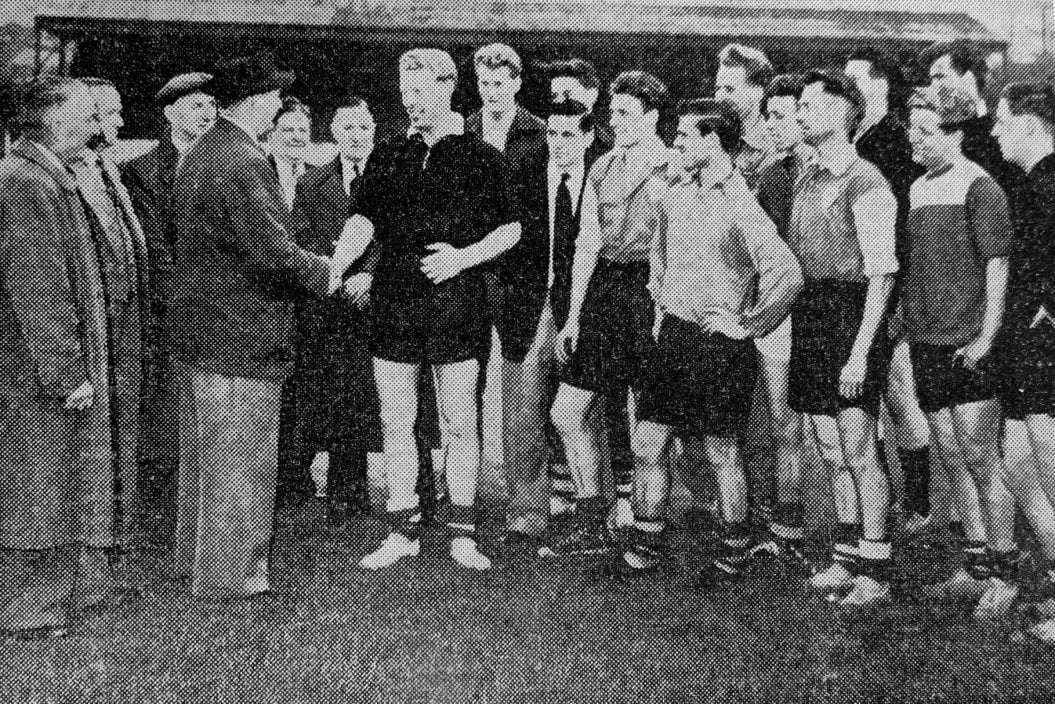 Mr A Roberts, Denaby United manager, pictured greeting Peter Miller and other new Denaby United players when the club held their first training period  on Tuesday