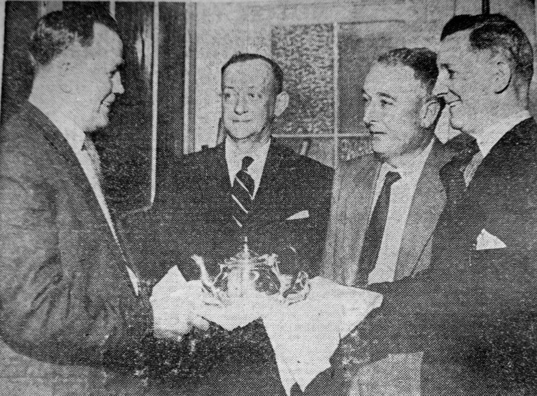 Denaby United Football and Supporters’ Club held their joint fourth annual dinner-dance at Denaby Welfare Hall on Friday. Here, Mr. J. Ford, former Chairman (right) receives a coffee set from Mr. M. Taylor.