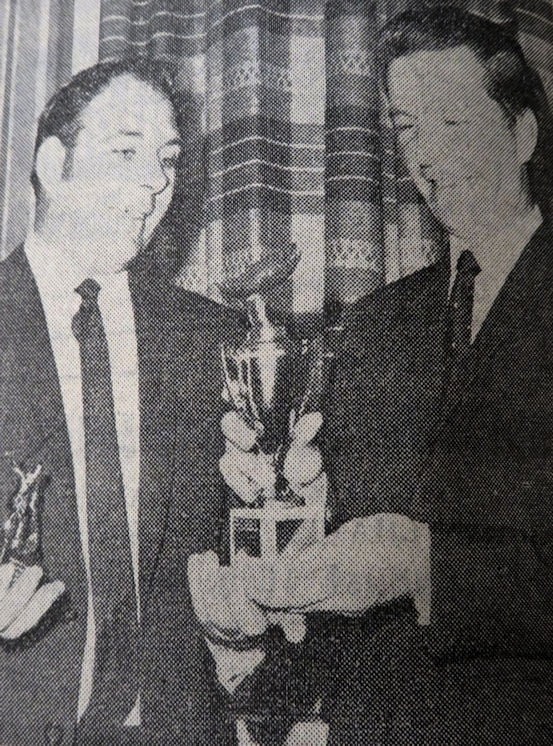 Mr. K. Jenkinson (right), presents first prize to Me. K. Bailey at the Denaby Welfare Angling Club’s dinner on Saturday.