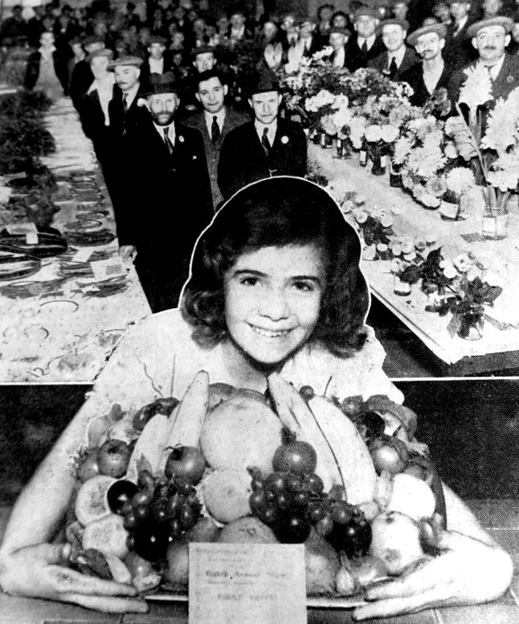 A view of the fine show in the Denaby Welfare Hall, promoted by the local Garden Allotment Association last Saturday. At the head of the little procession in the aisle are the judges, Mr. W. Dobson and Mr. R. Watson, of Sheffield. In the foreground the little girl is caressing a magnificent tray of fruit exhibited by Mr. F. Barber, the local cemetery superintendent.