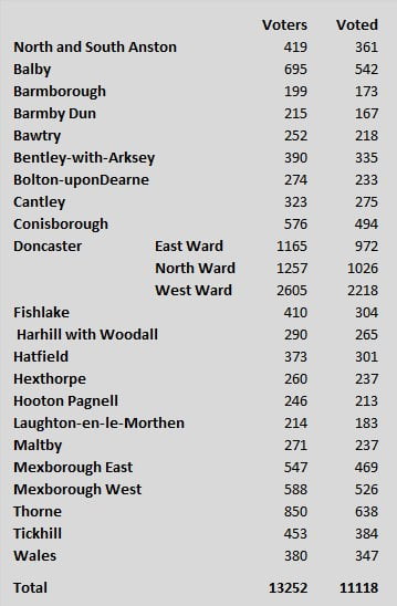 Our anticipations yesterday were fully verified. The poll is the heaviest ever taken in the Doncaster Division. Out of a possible 13,233 no fewer than 11,118 went to the booths. The total number of good votes was 11,057, the balance (61) representing the papers which from some reason other were not counted, only eleven being put down spoilt.”