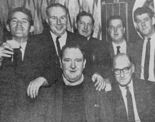 Mr F. Prince (secretary and organiser) and Mr C Gladwin (marker) with 5 of the finalists in the”Harold Haigh” darts trophy competition at the Eagle and Child