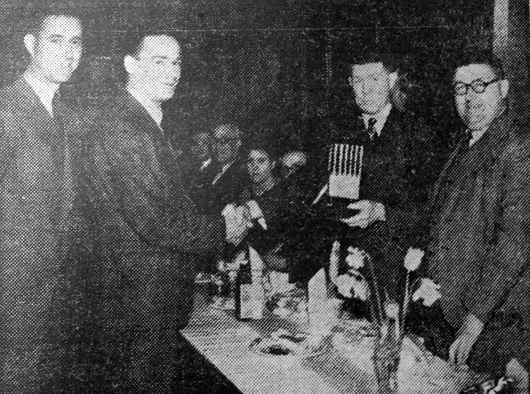 There were gifts for ex-Denaby United F.C. skipper Fred Osborne (left) and Bernard Saxton (right) in season 1949-50 leading goalscorer in the Midland League at Friday’s annual dinner of Denaby United F.C. Supporters’ Club.