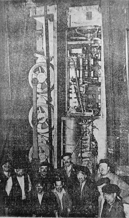 Cadeby Colliery Engineer, Frank Umpleby, and his crew pose on Monday in front of a 15-ton Diesel locomotive they had just worked into position for lowering- down the pit shaft.