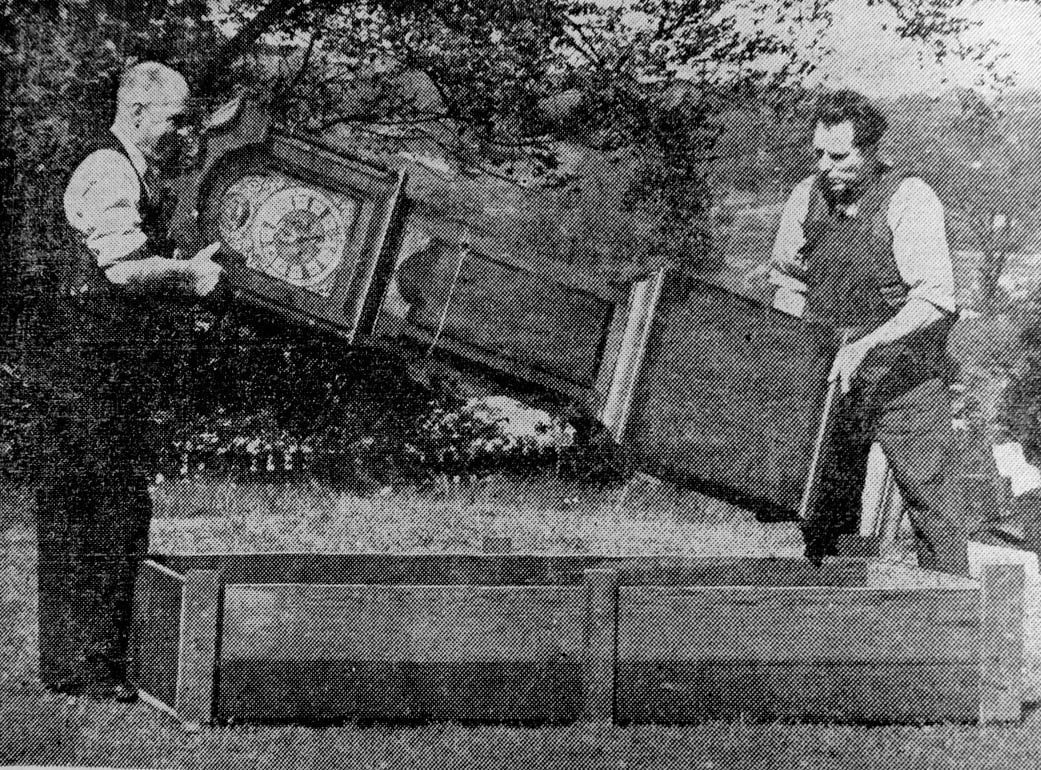 This Grandfather Clock, at least 100 years old, was being packed on Monday at Castle Grove, Conisbrough, by Mr Herbert Downing and his son, Mr G. P. Downing, in readiness for its 7,000 mile journey to the U.S.A. to a former Conisbrough man, Mr Ronald E. Booth, to whom it has been sold.