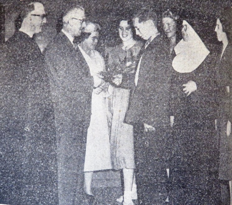Mr G Williams, headmaster of Denaby St Alban’s Catholic school for 21 years, pictured on Wednesday when he received a wallet and cheque from Michael Carmody on behalf of of the pupils and staff.