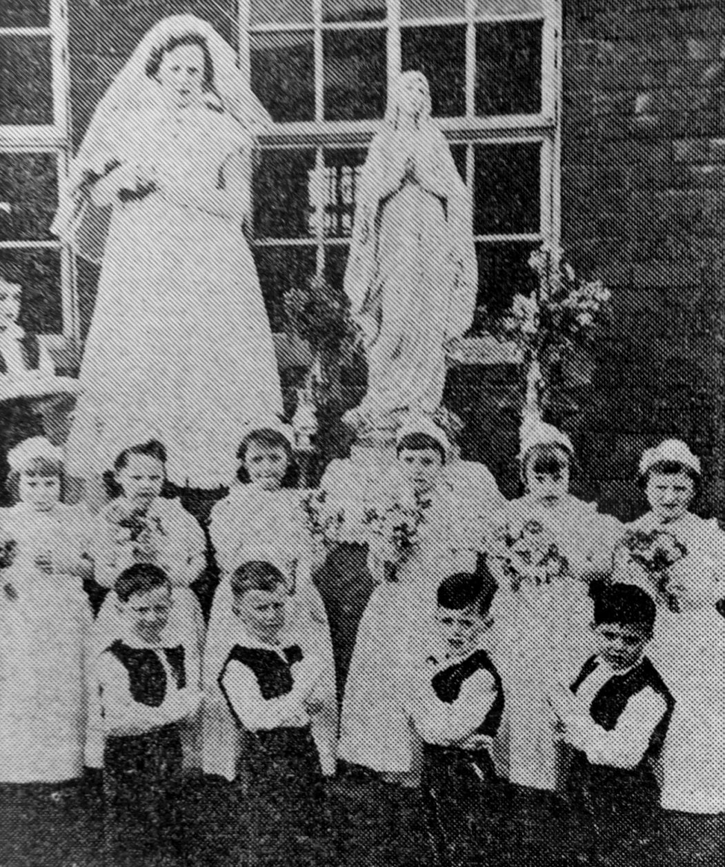 Helen Fitzwilliam, May Queen, seen with members of her retinue before moving off in the May procession at St. Albans R.C. Church, Denaby Main, on Sunday.