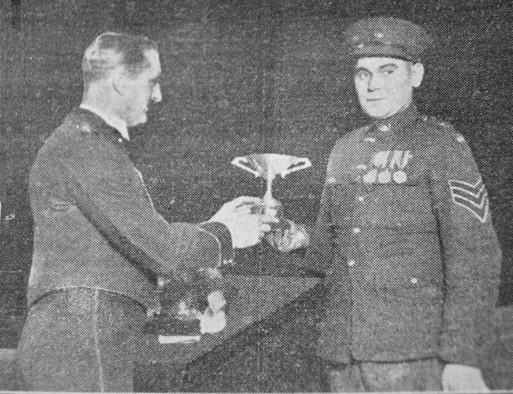 Colonel N.E.Barber, Officer Commanding the 5th King’s Own Yorkshire Light Infantry, presenting to Sergt. Squires (5th Platoon, “B” (Conisborough) Company, the inter-platoon challenge cup for the smartest platoon in the Battalion.