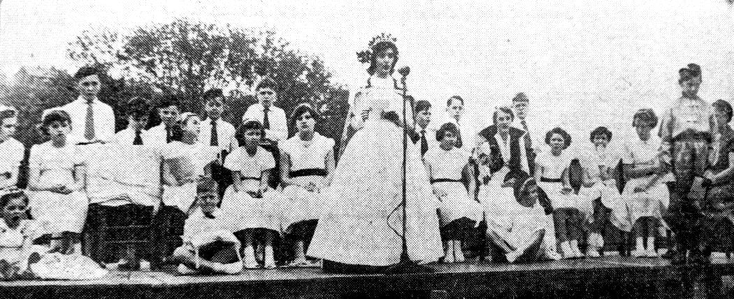 Carol Jones, May Queen of Conisbrough Station Road Infants’ School, is crowned by Irene Mason.
