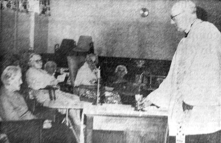The Reverend G.F.Braithwaite, Vicar of Conisbrough, conducting a morning service at Conisbrough Hospital, is using the new sacred vessels which were dedicated at the hospital on Friday